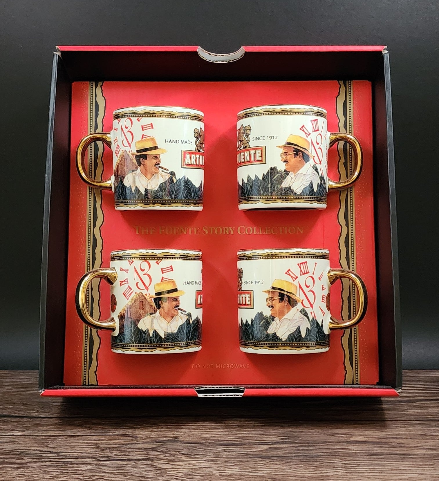 A set of 4 hand painted Arturo Fuente espresso cups in a custom gift box. This stunning set is an excellent gift for any occasion for any coffee lover, Arturo Fuente fan, or for yourself to enjoy with your morning espresso.