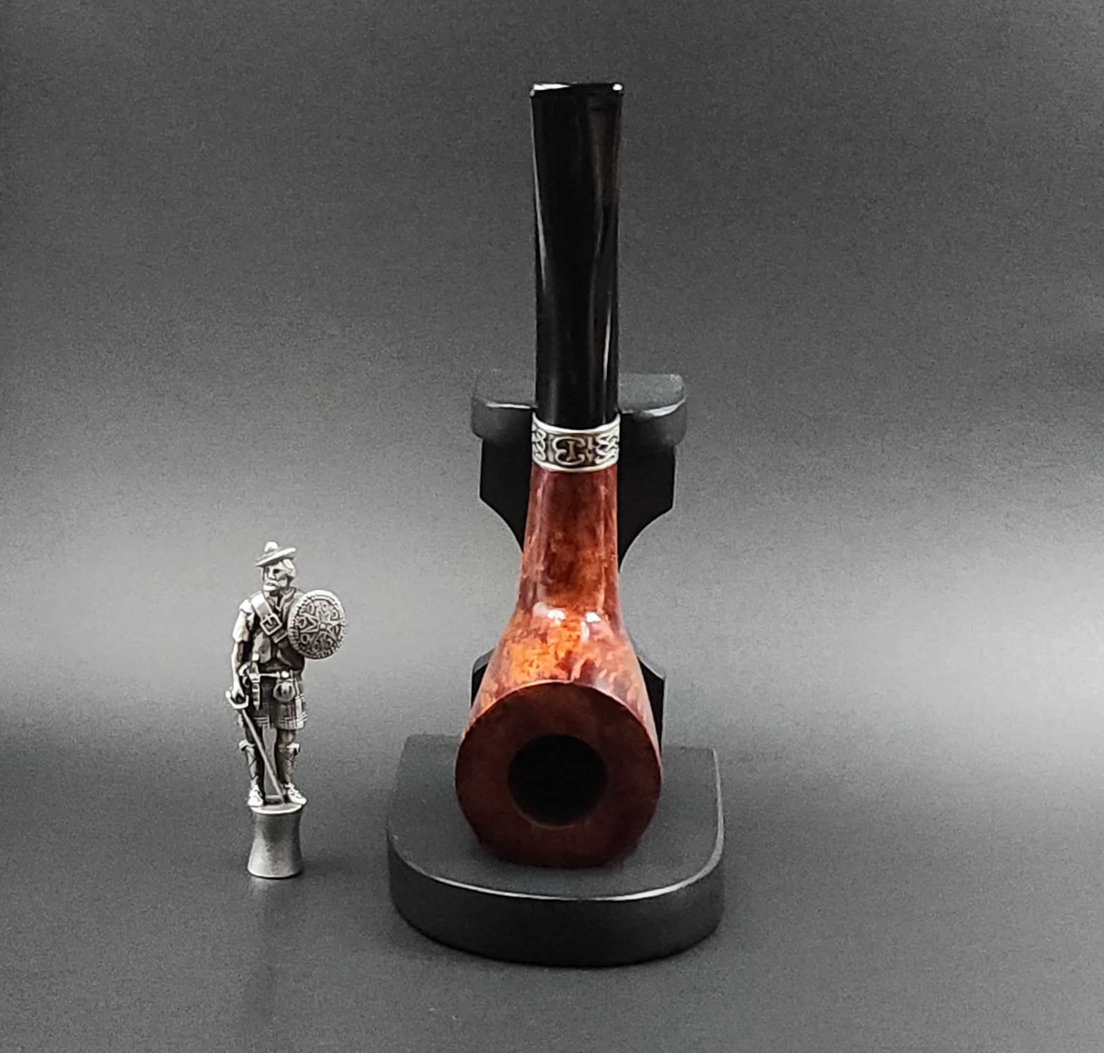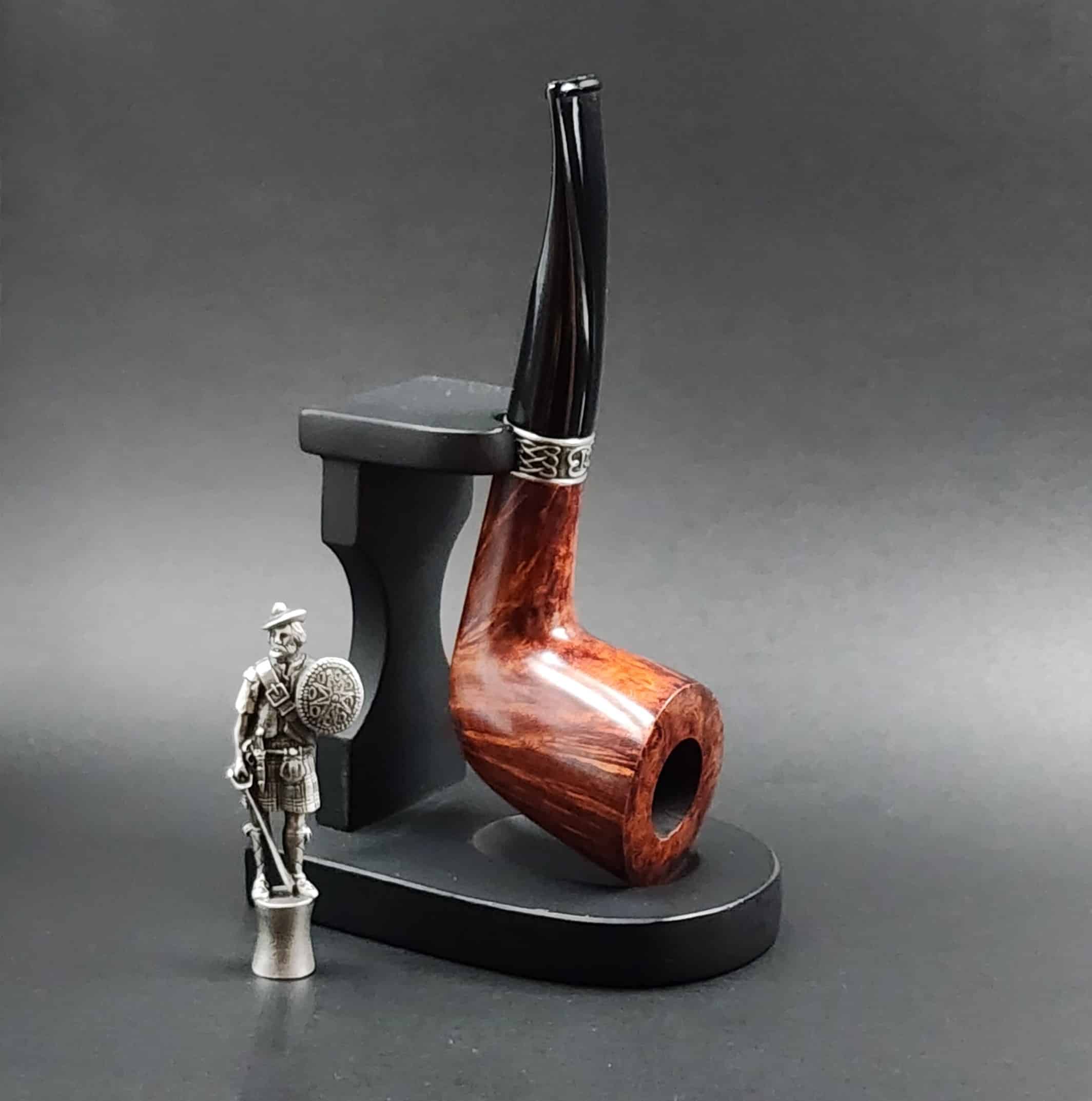 The Highlander is a powder horn, one of the most prized and beautifully decorated items in the Highland warrior’s kit, was the inspiration for this shape. This pipe, the second installment in our Scottish theme, is handmade from premium briar, adorned with a pewter Celtic cuff and accompanied by a pewter Highland warrior tamper.