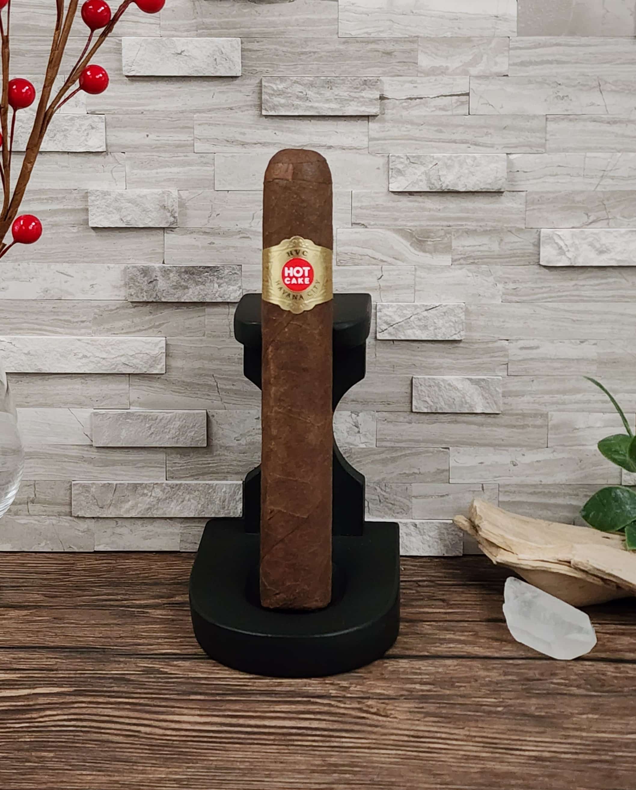 The blend for the HVC Hot Cake features a San Andres wrapper. The blend also uses Nicaraguan tobaccos from the Aganorsa farms. This includes Corojo ’98 from Estelí for the binder and a component of the filler. The filler also uses utilize three different varieties of the Corojo 2006 Maduro described above.