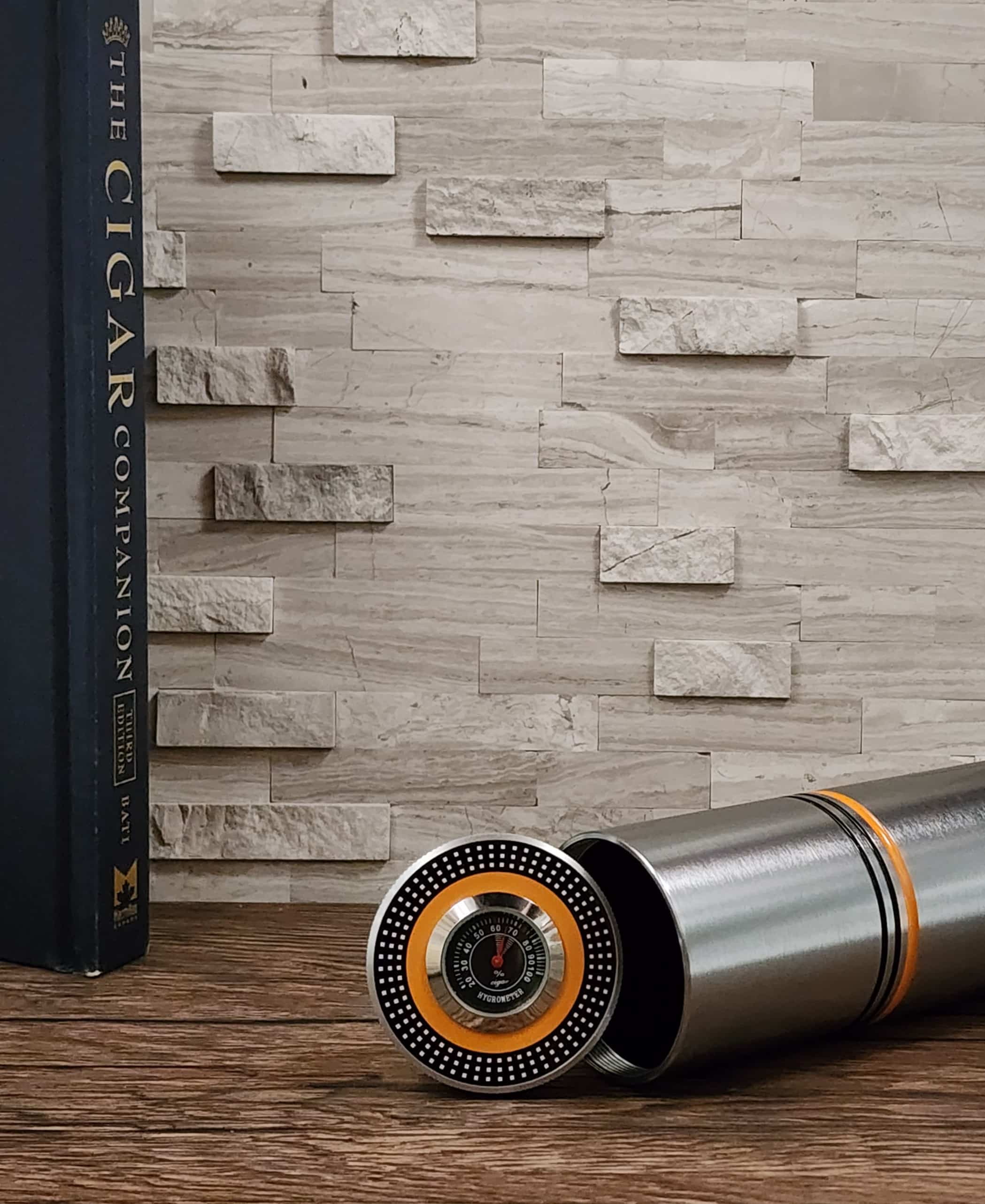 A high quality zinc alloy with a bright yellow finish. This will keep your cigars safe during your travels. An airtight seal.