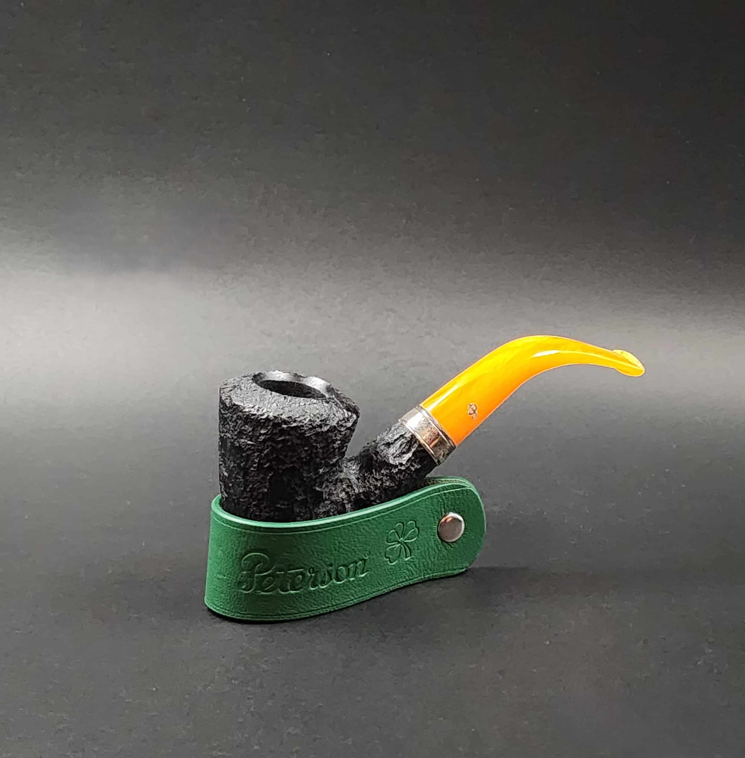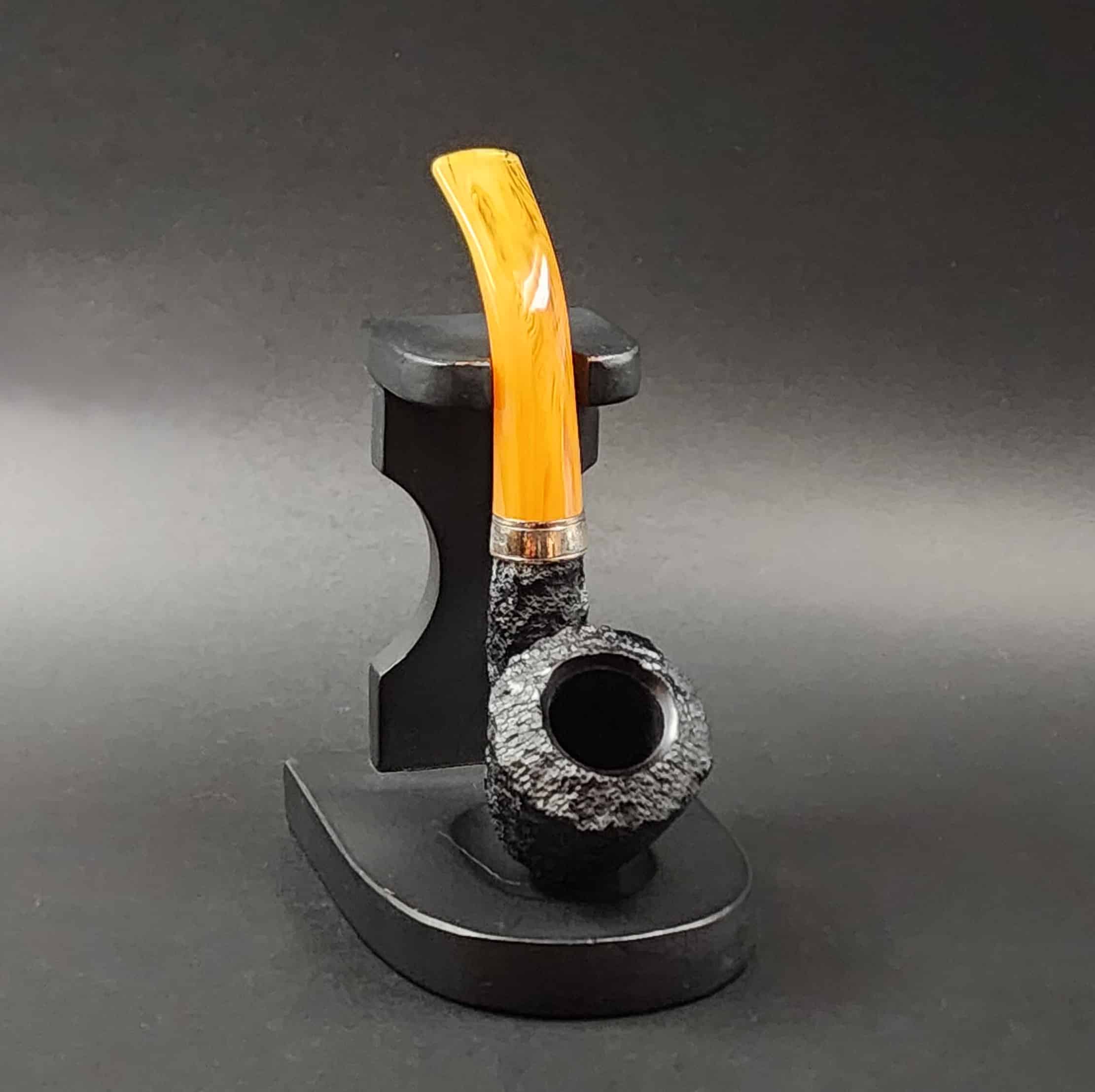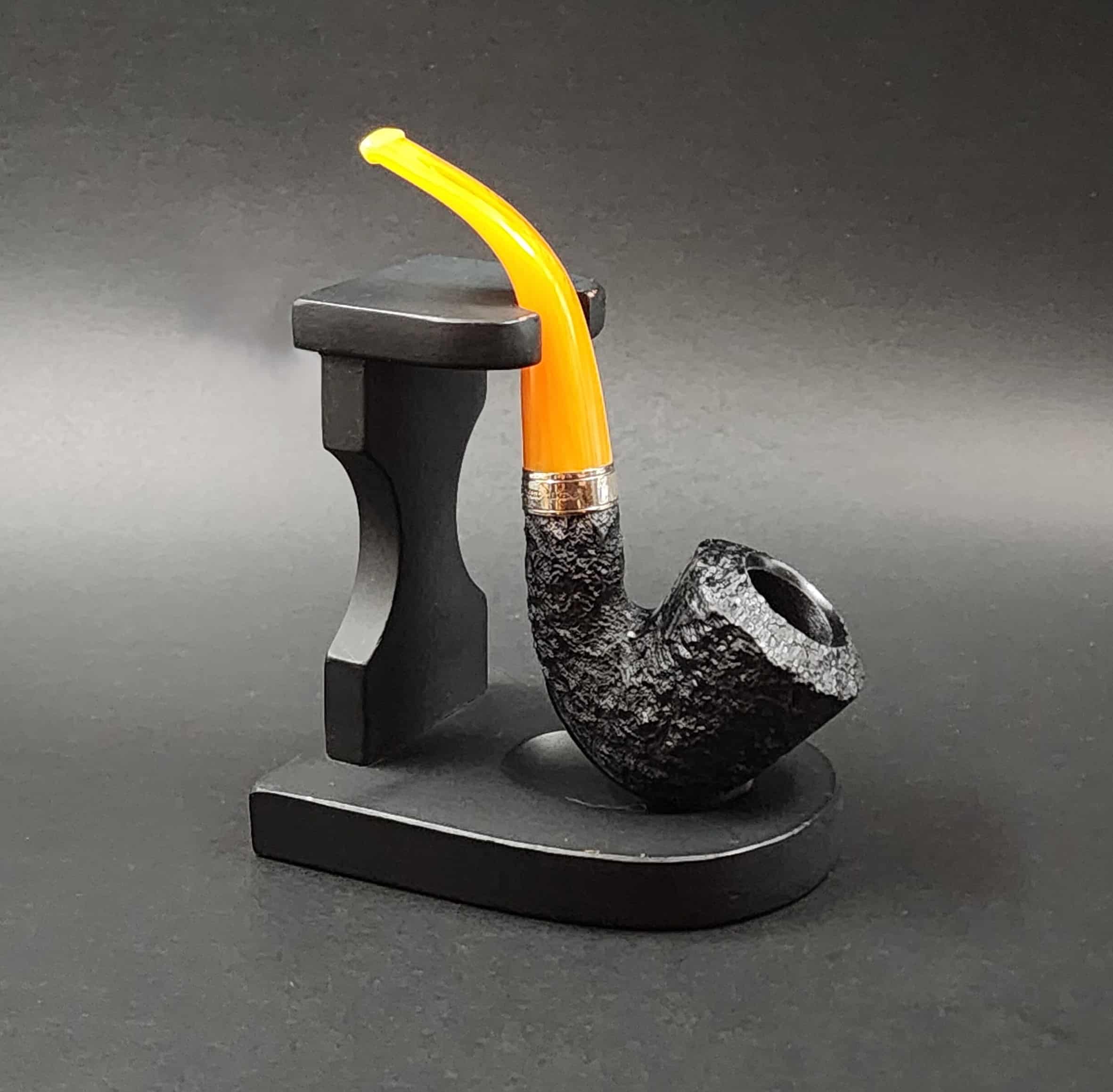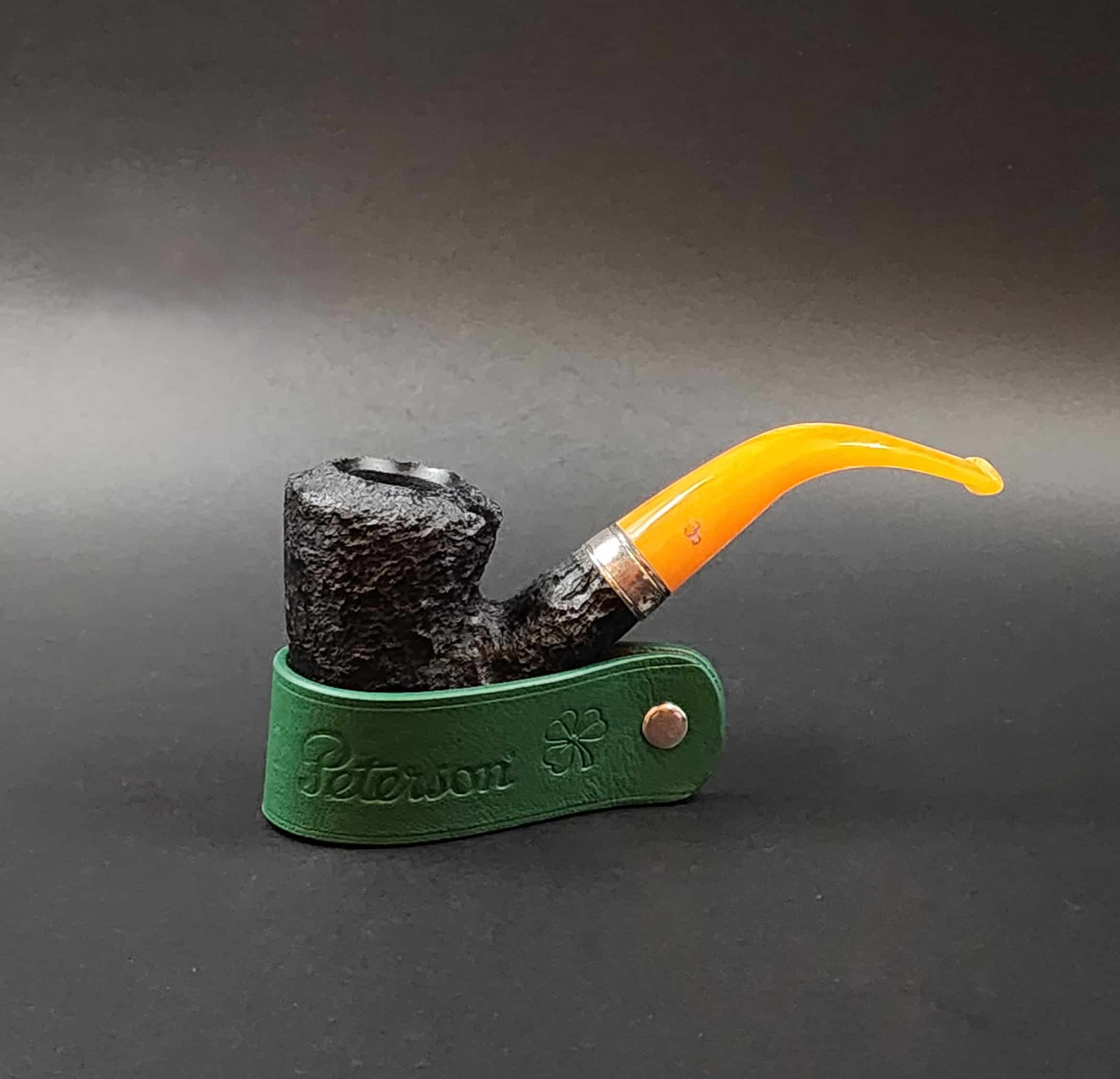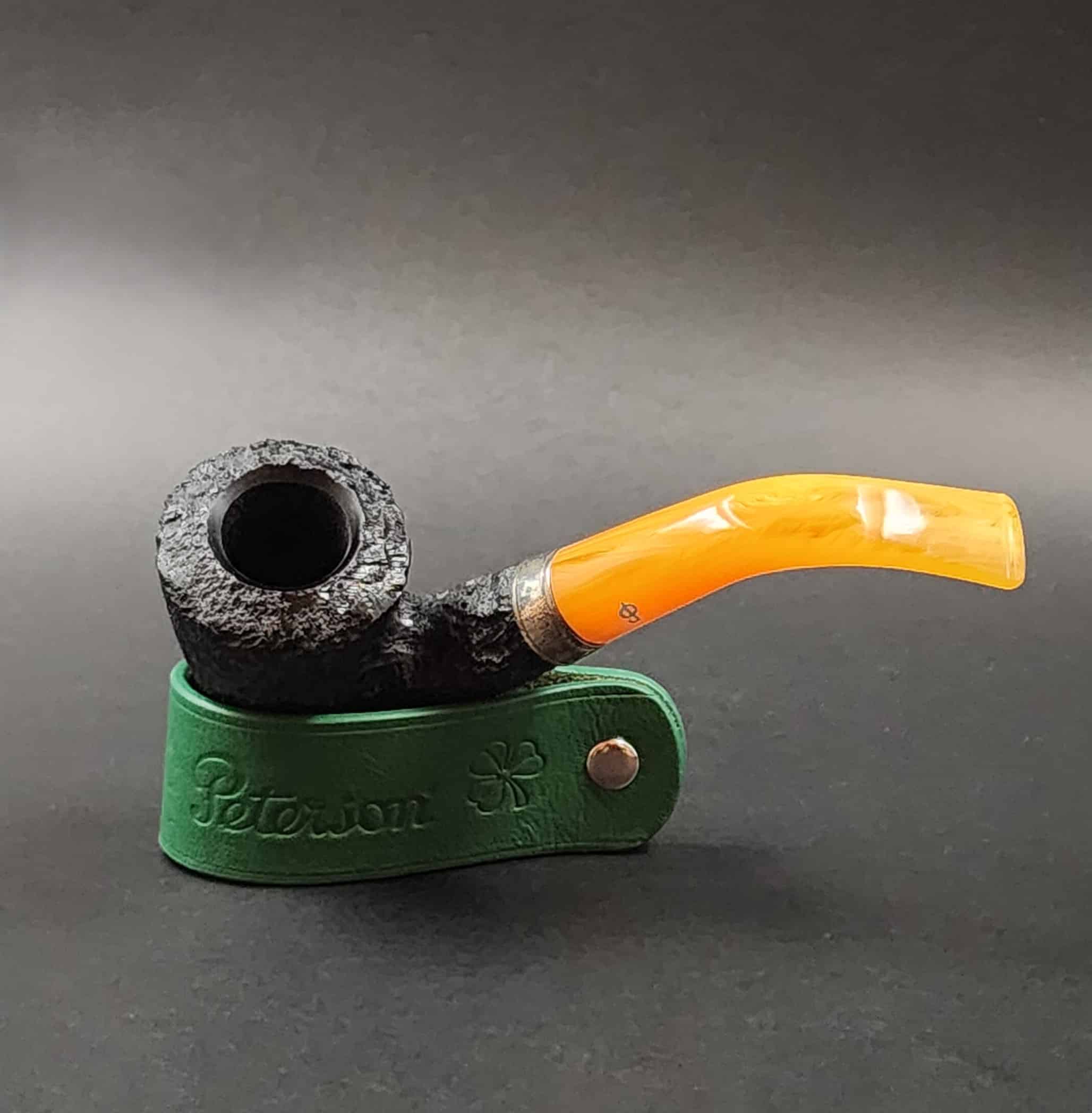 A striking amber coloured stem with silver accents. The Rosslare series is part of the premium line from Peterson. The extra-dark rustication provides a high contrast profile for this pipe.