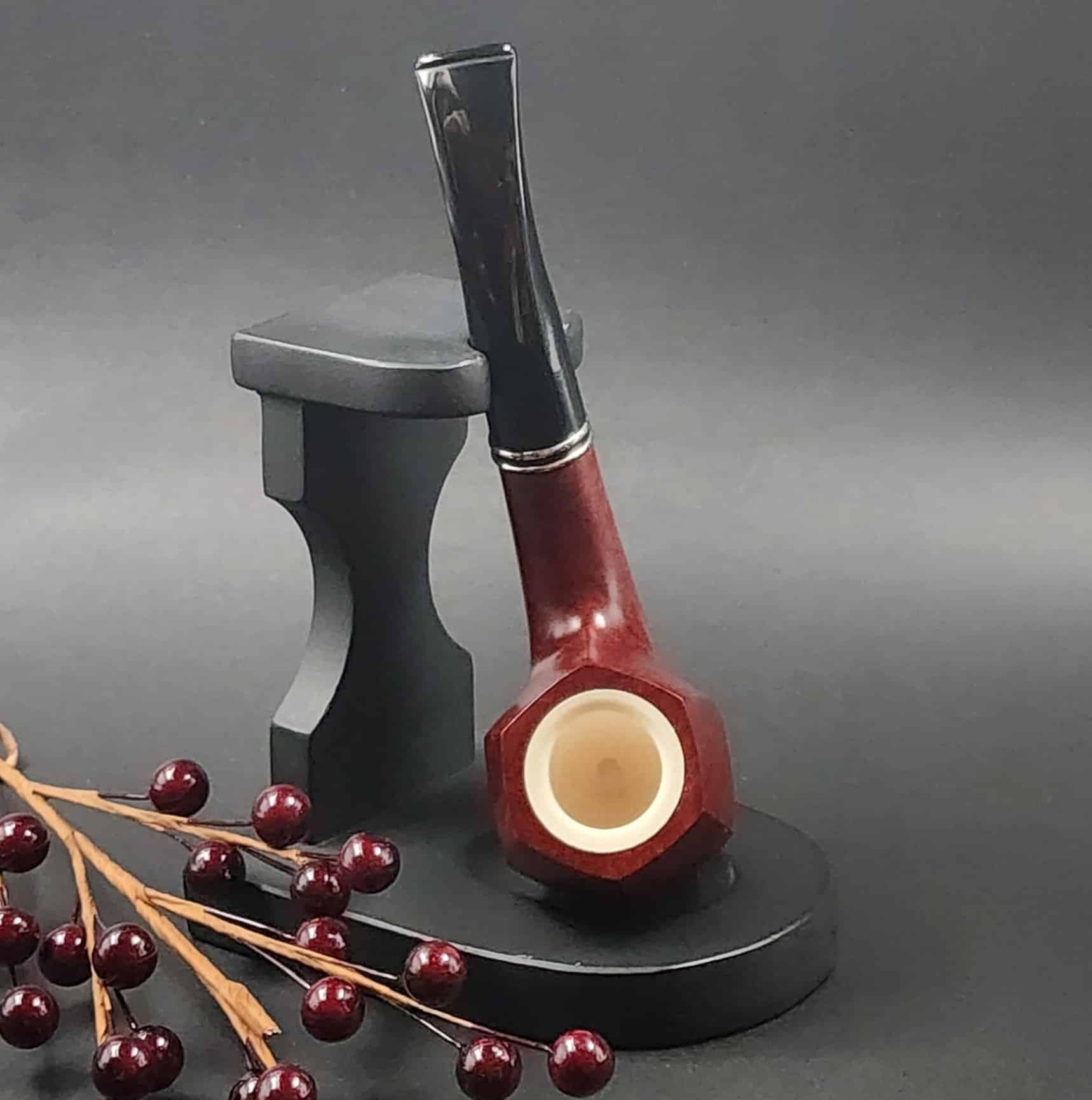 A bent paneled apple pipe with meerschaum bowl and dark auburn polished finish.