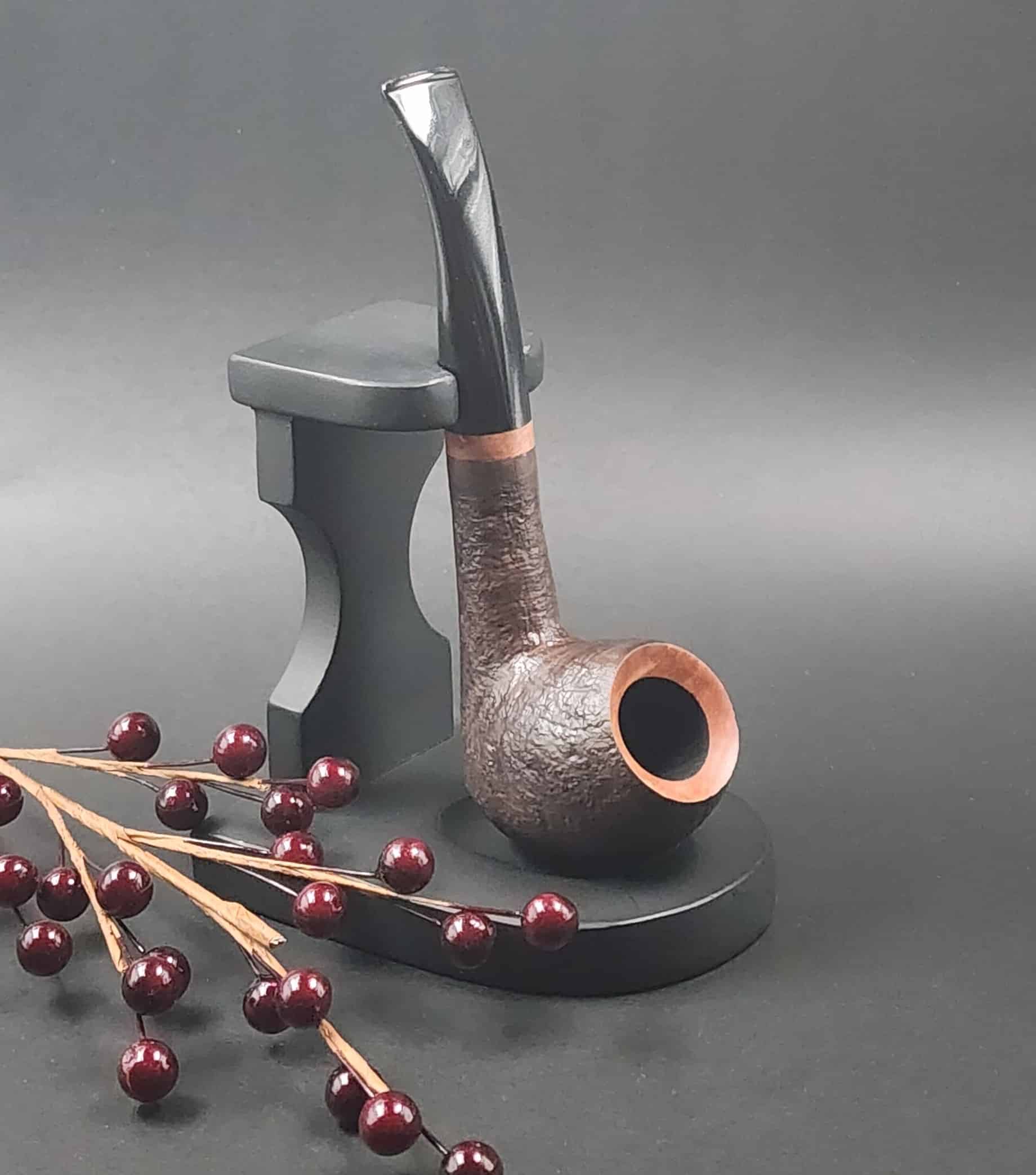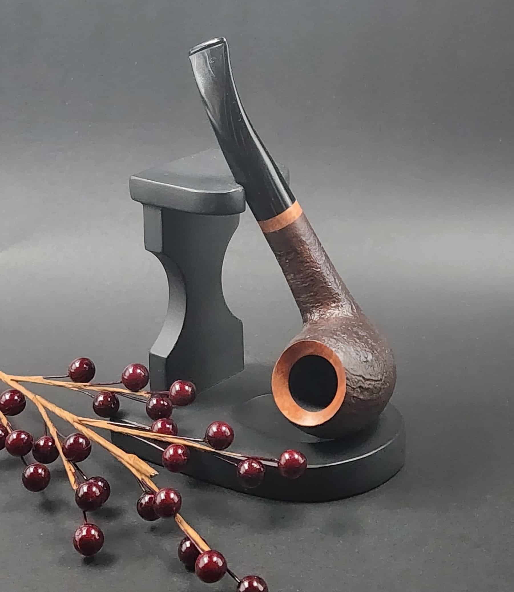 The deep brown sandblasted surface creates a harmonious contrast to the natural briar wood that appears at the top of the bowl and at the end of the stem. The relief-like protruding grain ensures optimum heat dissipation.